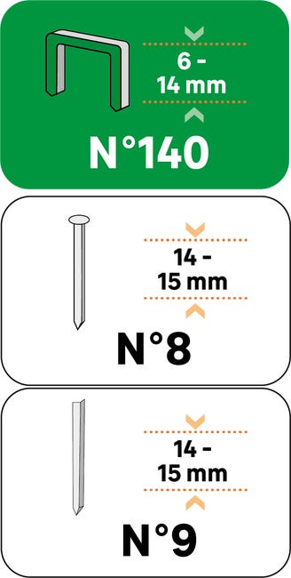 - Compatibilité : Utilise des agrafes NO.140 (6-14mm) et des clous NO.8 (14-15mm) et NO.9 (14-15mm)