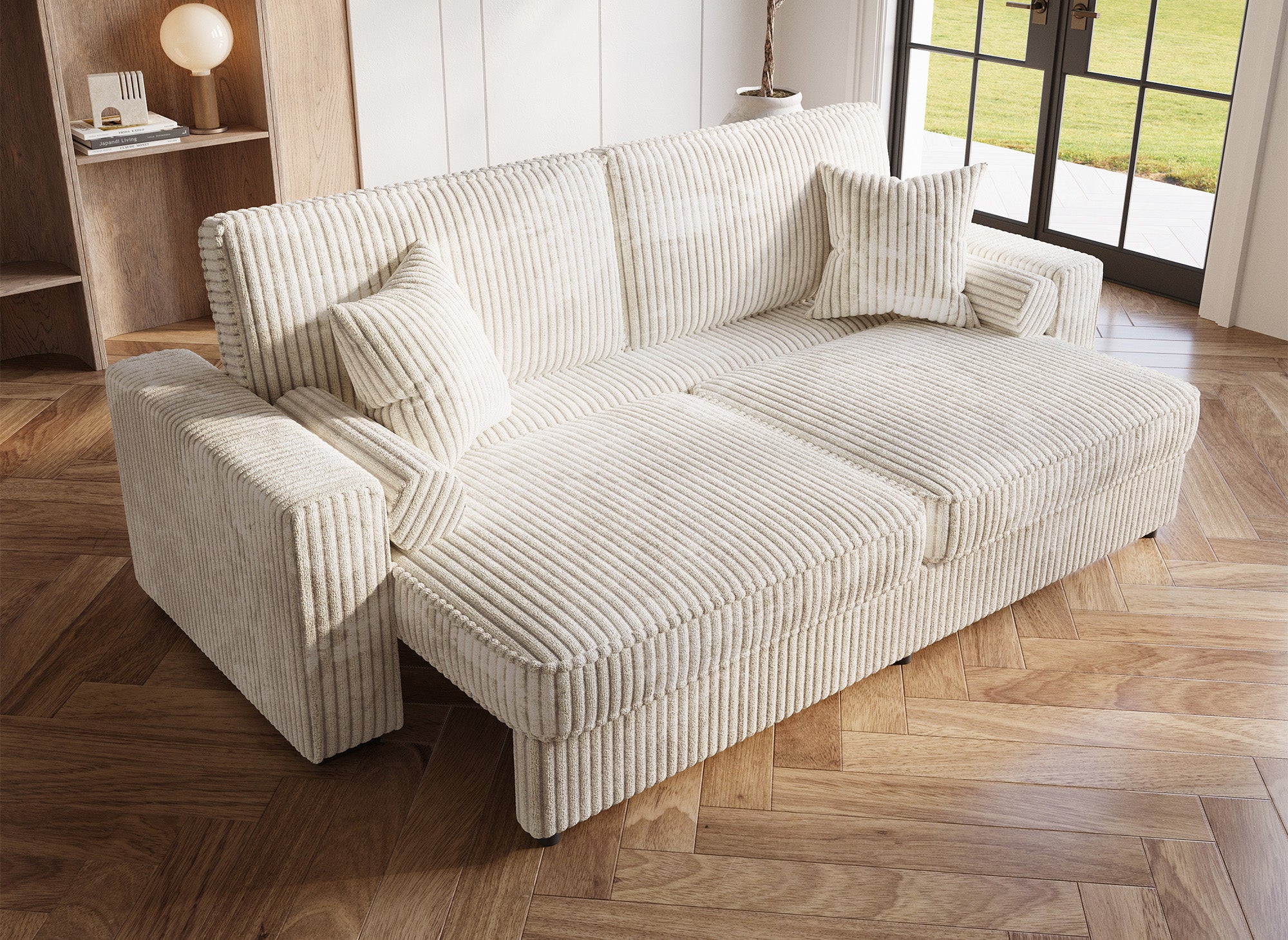 Si vous recherchez à la fois style, confort et fonctionnalité, notre canapé convertible 3 places en velours côtelé épais beige ALINE est le choix idéal !