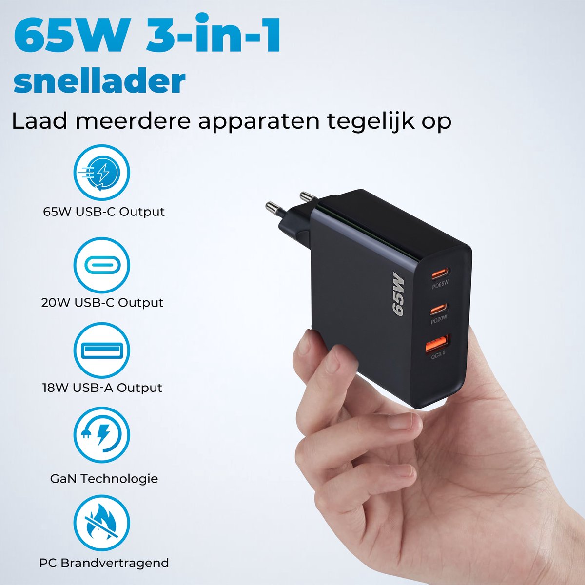 Chargeur rapide 65 W – 2x USB-C PD Fast Charge – 1x USB-A Quick Charge 3.0 – Chargeur 65 Watt – Technologie GaN – Adaptateur USB-C – Convient pour iPhone, Samsung, ordinateur portable, etc.