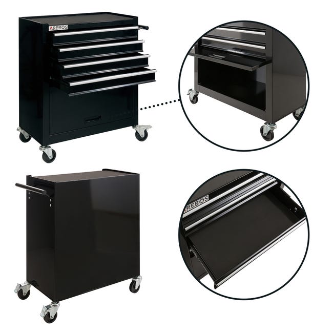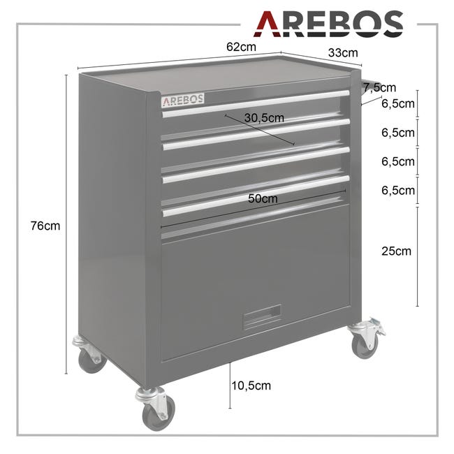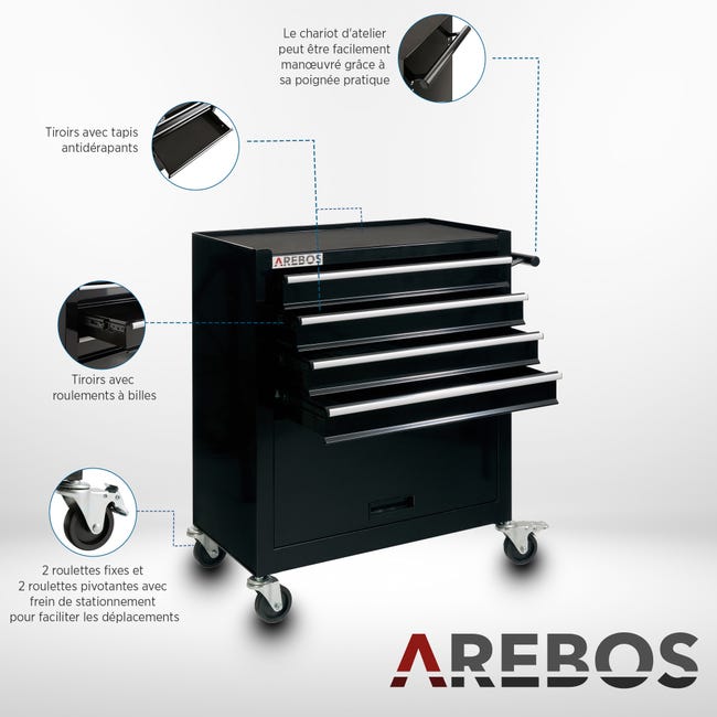 • Capacité de rangement exceptionnelle : Équipé de 4 tiroirs spacieux et d’un grand compartiment, il vous permet de garder vos outils bien organisés et à portée de main.