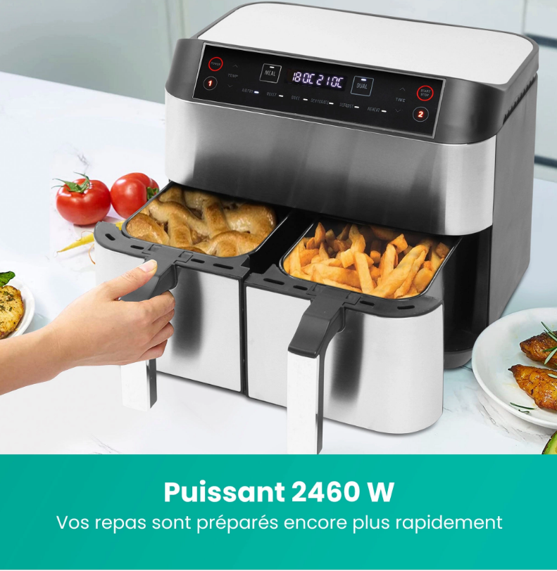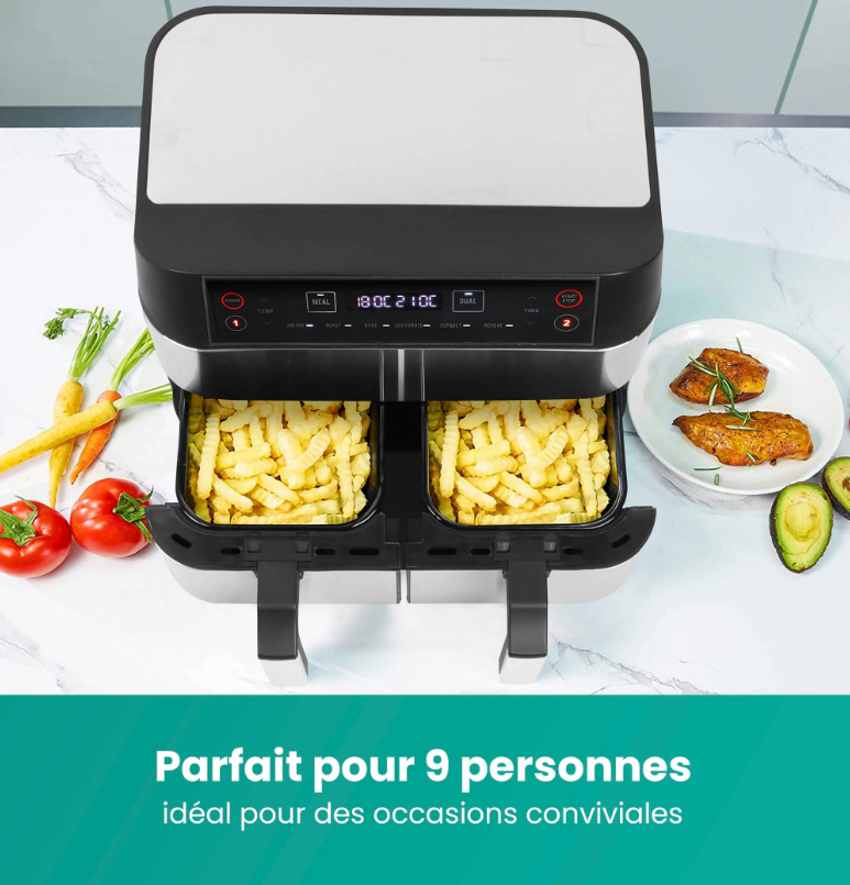 La préparation des repas n’a jamais été aussi efficace et délicieuse ! Avec la friteuse Niceey Airfryer XXL, vous découvrirez une façon plus intelligente et plus saine de cuisiner. Cet appareil révolutionnaire associe des températures élevées, un contrôle du temps et une capacité exceptionnelle pour vous offrir une expérience culinaire ultime. Grâce à sa capacité de 8 litres, vous pouvez désormais préparer des repas de toutes tailles. Idéal pour les familles nombreuses, les fêtes ou tout simplement pour ceux qui aiment cuisiner. Cet Airfryer XXL dispose de deux tiroirs de cuisson séparés, de 4 litres chacun, ce qui vous permet de préparer deux recettes différentes en même temps. De plus, il dispose de 6 programmes de sélection automatique, du gril à la cuisson, qui garantissent que vos plats sont prêts en même temps, ce qui rend la cuisine plus rapide et plus efficace. Fabriqué en acier inoxydable et en plastique ABS de haute qualité, ce sèche-cheveux est robuste et durable. De plus, il est doté d’une fonction anti-calcaire améliorée qui lui permet de briller plus longtemps. Il n’y a donc RIEN à craindre pour le nettoyage. Le Niceey Airfryer XXL est conçu pour rendre la vie en cuisine plus facile et plus agréable. Grâce à ses deux tiroirs indépendants, vous pouvez préparer plusieurs plats en même temps, et ses 6 programmes de sélection automatique vous permettent de préparer des repas rapidement et efficacement. De plus, sa conception robuste et durable vous permet de profiter longtemps de vos recettes préférées. Préparez-vous à cuisiner plus intelligemment avec le Niceey Airfryer XXL !
